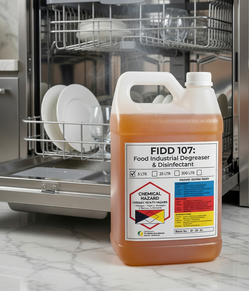 Dapur profesional dan industri makanan membutuhkan standar kebersihan yang jauh lebih tinggi daripada rumah tangga biasa. FIDD 107 (Food Industrial Degreaser & Disinfectant) adalah solusi pembersih konsentrat tinggi yang dirancang khusus sebagai Automatic Dishwasher Detergent sekaligus pembersih lemak (degreaser) untuk area food processing.